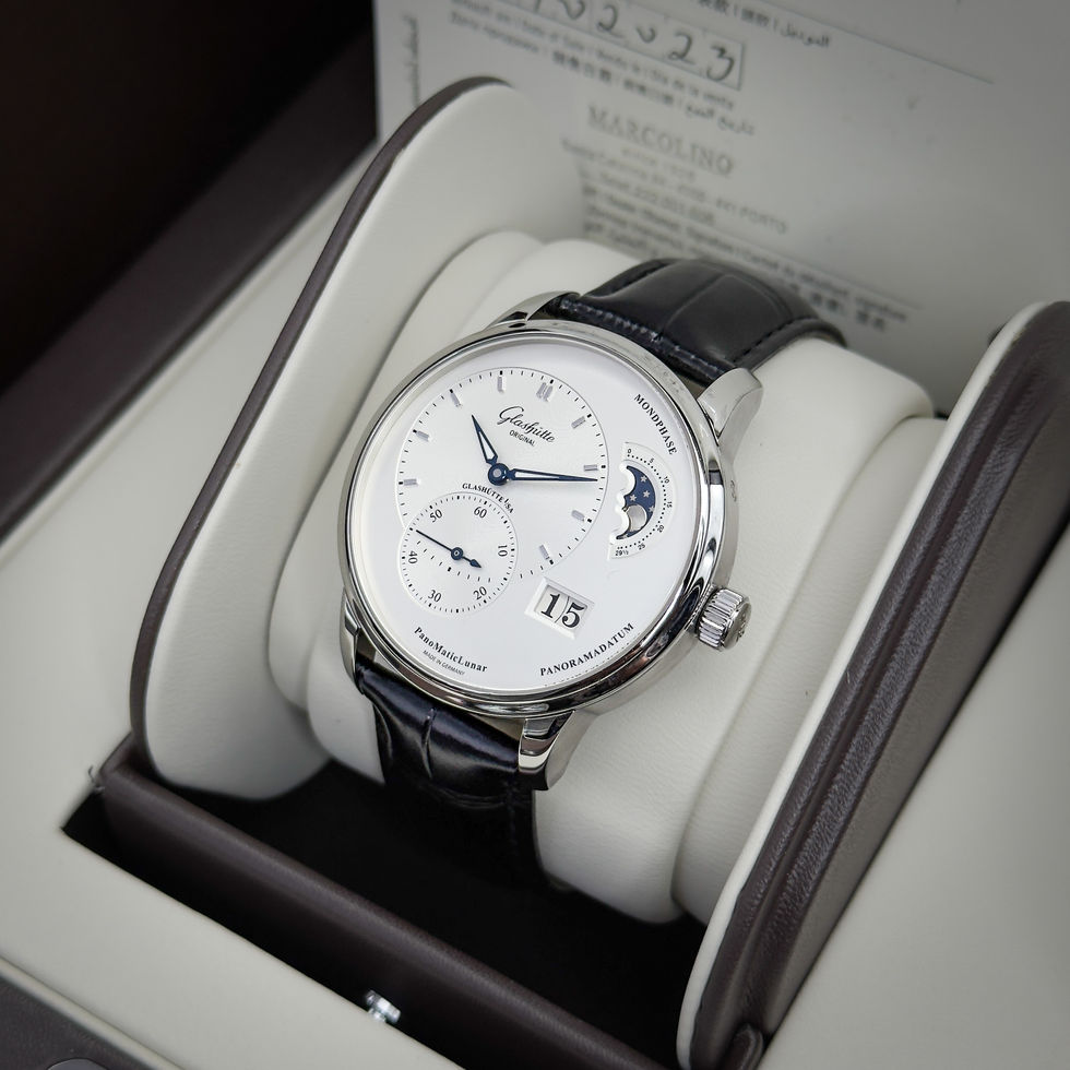 A beautifully executed example of Glashütte Original’s German watchmaking artistry, the PanoMaticLunar blends asymmetric design with mechanical refinement. Featuring the brand’s signature off-center time display, moon phase complication, and large date, it delivers both horological sophistication and timeless elegance.